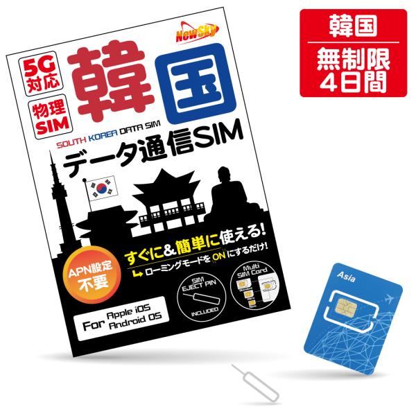 【5G対応!APN設定不要!】韓国データ通信SIM【無制限/4日間】(データ通信専用SIM/5G対応/マルチカット物理SIM【標準(Mini), Micro, Nano SIM対応】)