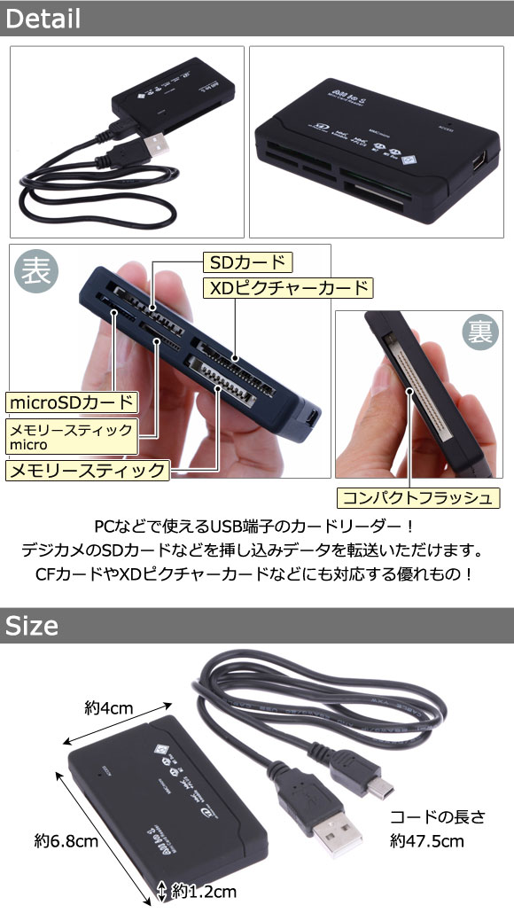 - USBカードリーダー USB カード リーダー メディアリーダー アダプタ コネクタ PC パソコン SD SDカード SDメモリ メモリースティック メモリースティックDuo メモリ microSD マイクロSD MMC MS TF PRO DUO CF コンパクトフラッシュ XDピクチャーカード XD フラッシュメモリ USBメモリ マウス キーボード カメラ デジカメ ビデオ インストール 携帯 モバイル スマートフォン スマホ テレビ TV 動画 写真 データ転送 データ 転送 接続 変換 取り込み カラー: ブラック ホワイト 黒 BLACK 白 WHITE AP-UJ0318-BK AP-UJ0318-WH 4580066095197 4580066095203