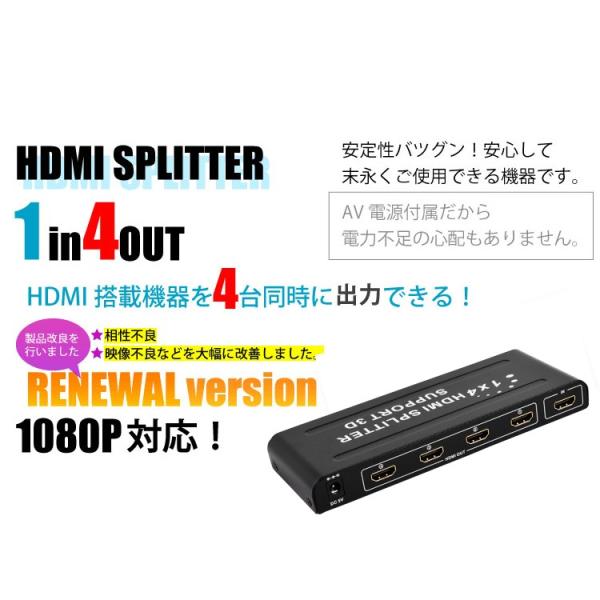 - ゲーム、BRプレーヤー、レコーダーなどのHDMI機器を、簡単に切替表示できるHDMI分配器です。 AC電源付属で差すだけなので、別途ACアダプタなどは必要ありません。(パワー不足の際はACアダプタをご使用ください) 製品仕様 HDMI規格 HDMI1.4b max bandwidth 340MHz 解像度 4k・2k/1080p/720p 最大解像度 1080p HDMI端子 入力:1系統 HDMI タイプA 19ピン 出力:4系統 HDMI タイプA 19ピン 外形寸法 約6.7×18×2 cm 重量 約252g 電源 DC5V2A 電源付属(PSE付コード) 製品保証 初期不良2週間 ※本製品は切替機(セレクター)機能はありません。予めご注意ください。 ※HDMIケーブルは付属されておりません。別途ご用意下さい。 ※出力先の解像度がそれぞれ異なる場合は、低い方の解像度に合わせて出力されます。 ※出力先のテレビ・モニタ側の設定・仕様によって正常に出力されない場合があります。 ※入荷時期によりデザイン・接続部の配置が変更になる場合があります。 本製品の相性保証について *HDMI機器間での相性について HDMIは新しい規格で様々なバージョンがあるために、特定の機器とを組み合わせた場合、使用できない場合がございます。 このセレクターを使用し下記の全条件を満たしたにも関わらず相性により使用出来ない場合は、返品をお受けします。 二つの機器を直接ケーブルで接続した場合は使用出来るが、このセレクターを挟むと使用する事ができなくなる場合。 DVI-HDMI変換コネクタなどを使わずHDMI出力・入力を持っている機器での接続をした場合。 *HDMI機器間での相性について HDMIは新しい規格で様々なバージョンがあるために、特定の機器とを組み合わせた場合、使用できない場合がございます。 メーカー希望小売価格はメーカーサイトに基づいて掲載していますHDMI分配器 4出力1入力 切り替え機能付き プレイステーション3やBDレコーダなどHDMI機器のダブル出力もこれで解決! 1080p対応 HDMI分配器電源とHDMIケーブル以外の余計な配線は必要ありません。 接続状態がわかるLEDライト搭載何番の入力端子の映像を出力しているか一目でわかるLEDライトを搭載。 人気のHDMI セレクターをさらに値下げ! ◆ HDMI端子は、ケーブル1本で、デジタル映像と音声を高画質・高音質のまま伝送することができる新しいマルチメディアインターフェースとして、注目されており、HDMIを標準搭載した1080pの高解像度・大画面の薄型テレビは、家庭用テレビの定番となりつつあります。これらの動きにともない、ハイビジョン番組を録画するためのHD DVDレコーダーやBD(ブルーレイディスク)レコーダー、HDMI出力が可能なビデオカメラやパソコン、PLAYSTATION 3など、HDMI端子を搭載したデジタル家電製品が増加しています。 ところが、現在、薄型テレビに搭載されているHDMI端子の数は、1〜2ポートで、端子不足のために、HDMI搭載機器を接続できないケースもあります。 HDMIスプリッタを使えば、一度に最大4台までのHDMI搭載機器を接続し、高画質・高音質(1080P)のまま表示することができます。 今ならHDMIコネクタのおまけ付き!(オプションサービス)