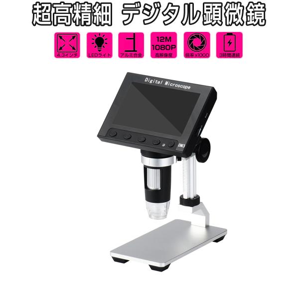 デジタル顕微鏡 4.3インチ液晶 マイクロスコープ 500〜1000倍率 写真1200万画素 動画フルHD画質 研究 生物 標本 観察 スキンチェック 基盤検査 修理 1ヶ月保証