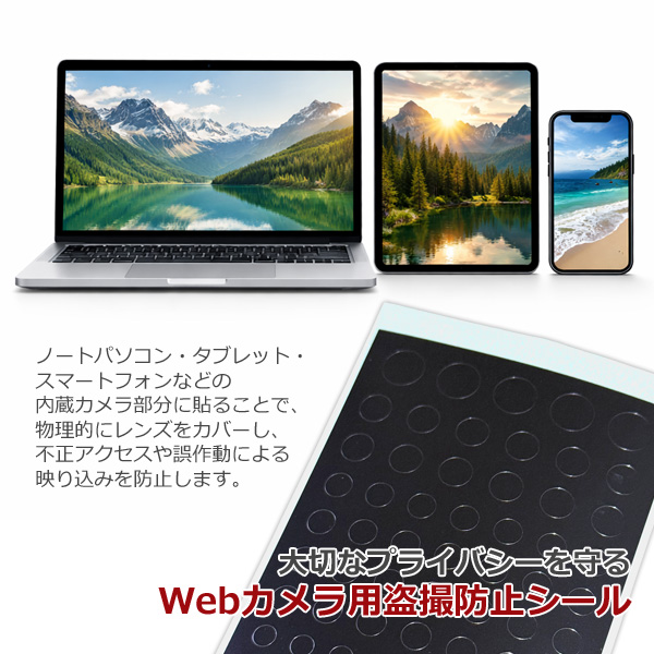 - Webカメラ用 盗撮防止シール 2枚セット カメラカバー ノートPC タブレット スマホ対応 貼るだけ簡単 プライバシー保護 貼るだけ!簡単!物理的にプライバシー保護! 大切なプライバシーを守る、Webカメラ用盗撮防止シール2枚セットです。 ノートパソコン・タブレット・スマートフォンなどの内蔵カメラ部分に貼ることで、 物理的にレンズをカバーし、不正アクセスや誤作動による映り込みを防止します。 シンプルな貼り付けタイプのため、複雑な構造がなく、貼るだけで簡単にご使用いただけます。 テレワークやオンライン会議、オンライン授業、外出先でのPC使用時など、 日常のさまざまなシーンで安心感をプラスします。 貼り付け前にレンズ周辺の汚れや油分をよく拭き取ってください。 ・サイズ(約) 縦90×横60mm ・セット内容 2枚セット ・シール内容 【シール1枚当たりの●シール】 φ2.5mm×9、φ3mm×9、φ3.5mm×8、φ4mm×8、φ5mm×28、φ6mm×12、φ8mm×5 ・色 ブラック ・広告文責 株式会社スポット TEL:06-6902-7681 ・発売元 株式会社アメージングクラフト ・区分 製造国:日本 ※PC環境などにより、画像と実際の商品とは多少色味が違う場合があります。ご了承ください。 ※予告なくパッケージ、デザイン、および仕様等が変更になる場合があります。ご了承ください。