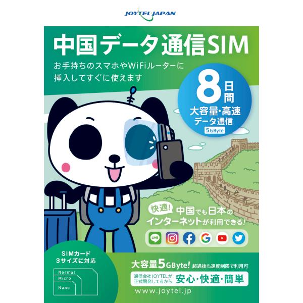 - 海外SIMなら世界的ブランドJoytelSIM (ジョイテルSIM)。中国で使えるプリペイドSIMカードです。VPN無しで中国本土でもLINE/Facebook/Googleなどが日本同様にご利用いただけます。 詳細な日本語マニュアルで事前設定も安心です。 海外旅行者向け世界的ブランドのジョイテルが提供する正規日本語版SIMです。 SIMサイズは標準/Micro/Nanoに対応しています。簡単に手で切り取ることができます。 ご利用可能なデータ容量は無制限です。ただし、5GByte使用すると速度制限となります。 中国で使える4G対応データ通信専用プリペイドSIMカード8日間(5GB使用すると速度制限)です。中国本土での利用の場合はローミング接続を行います。これにより中国政府のネット規制対象外となり、Google、Facebook、Twitter、Instagram等に接続可能です。 【注意】中国本土以外の香港・マカオ・台湾や日本等ではご利用いただくことができません。あらかじめご注意ください。 【注意】日本の一般的な通信会社が提供する「SIMロック端末」ではお使いできません。また、音声通話はできません。あらかじめご了承ください。 ・サイズ :14.8 cm x 10.5 cm x 0.2 cm ・素材:PETカード ・カラー:緑(パッケージ) ・モニターの発色具合によって実際のものと色が異なる場合があります。海外でも格安SIMの時代です。 これまで皆様が海外へ渡航する時には、インターネットが利用できるようにするためにどのようなサービスをご利用されていたでしょうか? 少し以前であれば携帯電話会社のローミングサービス。しかしこれは1日あたり数千円も課金されてしまうのであまり利用する人もいませんでした。 そしてここ数年であれば空港等の窓口で借りるモバイルWiFiルータが主流でしょう。窓口で渡航する国を伝えれば、その国で使えるモバイルWiFiルータをレンタルすることができます。しかし、これも依然として料金は高め、、1日毎のデータ通信料に加え、機器の保険料や受取料等を加えると1週間の渡航で航空チケットやホテル代の料金にも迫ることも多いでしょう。 せっかく最近は格安航空券等で安く海外に行くことができるのに、旅行費用全体の中でWiFiモバイルルータの通信料金の割合が大きくなってしまい、お悩みの方も多いのではないかと思います。 これに対し、日本国内ではスマホの通信料金が大幅に下がる格安SIMが流行っています。 これをお読みの皆様でも、日本国内では3大通信キャリア(ドコモやau、ソフトバンク)ではなく、SIMフリーと呼ばれるどの通信会社でも使えるスマホを使って、格安SIM会社(LINEモバイルやUQモバイル等)と契約をされている方も多いのではないでしょうか? そして現在は、国内でも格安SIM、そして海外でも格安SIMが利用できる時代になったのです。 世界的SIMブランドのJOYTELが提供するサービスをご利用ください。 JOYTELのイチオシ商品「中国8日間 4Gデータ通信使い放題SIM」には4つの特徴があります。 中国で8日間利用可能なデータ通信専用SIMです。JOYTEL社の販売子会社ジョイテル株式会社が提供する正規日本語版です。 SIMサイズは標準/Micro/Nanoに対応しています。簡単に手で切り取り、iPhone、Android、各種モバイルWiFiルータ等に挿入することができます。 中国でもLINE、Instagram、Google等、通常は通信規制によって見られないホームページも利用できます。 中国の各地域で4G通信が可能です。データ容量は使い放題です。ただし5GByte利用後に速度制限があります。 【注意】中国本土以外の香港・マカオ・台湾や日本ではご利用いただくことはできません。予めご確認をお願いします。 【注意】日本の一般的な通信会社が提供する「SIMロック端末」ではお使いできません。また、音声通話はできません。予めご了承ください。 以下の詳しい仕様も確認をお願いします。 JOYTEL提供のSIMがあれば中国でも快適にインターネットがご利用可能です。 VPNはもう要らない!中国でも日本のインターネットを安心してご利用いただけます。 中国では通信規制によりGoogle、Instagram、LINE等様々なWebサイトが利用できないということはご存じですか? JOYTELなら中国通信会社との提携により旅行者の皆様が快適にインターネットが利用できる仕組みを作りました。 VPNでは無いため、中国の規制によって通信が途切れることはありません。 中国でも快適にGoogle、Instagram、LINE等が使えます。 中国どこでも使えます!中国大手通信会社・中国電信の高速4G通信を利用しているから快適。 中国どこでも使えます! ジョイテル中国データ通信SIMは、中国大手通信会社・中国電信の4G通信を利用しています。 中国電信は中国でも最大手かつ最も歴史が長い旧国営の通信会社です。中国全土に携帯電話の基地局を設置しています。 上海や深圳、広州、蘇州、杭州等日本人が多く住む地域に営業基盤を持ち、これらの地域におけるつながりやすさに強みを持ちます。地下鉄や高速移動中でも快適利用が可能です。 設定も簡単です。複雑な手続き等はありません。中国到着直後からすぐにご利用いただけ