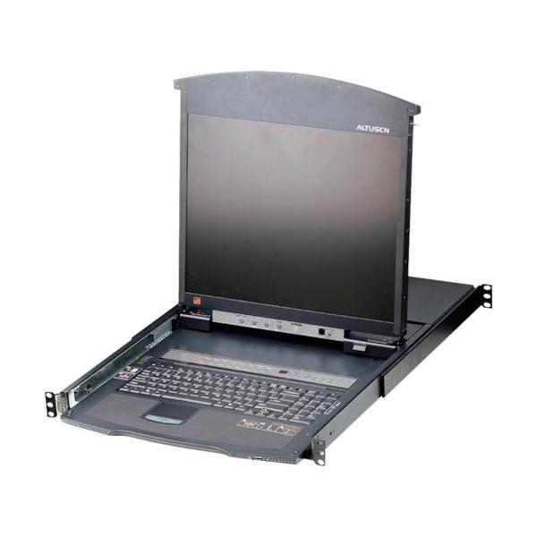 - 型番:KL1516ANJJSJANコード:4710423777484KL1516A は、17/19インチLCDを搭載した、カテゴリ5タイプの16ポートKVMドロワーです。本体はデュアルスライド構造を採用し、上下のモジュールが個別にスライド可能。このため、下部のキーボードモジュールはラックに格納し、上部のLCDモジュールだけを使ってシステムの監視をすることができます。また、サーバーの接続は、コンピューターモジュールと呼ばれるデバイスとカテゴリ5/6eケーブルを使って配線しますので、ケーブルの占有スペースを抑えられるのも特長です。本製品はKL1516の後継となる製品で、セカンドコンソールがPS/2とUSBの両方に対応しました。また、モジュールID機能やログインモード機能に対応し、OSDでは日本語メニューも利用可能。本来KVMドロワー自身が持っているスペース効率の高さに加え、利便性の高い機能でシステム運用の業務を快適にします。