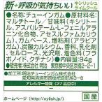 原材料:マルチトール、甘味料(キシリトール、アスパルテーム・L-フェニルアラニン化合物、アセスルファムカリウム)、ガムベース、増粘剤(アラビアガム)、炭酸カルシウム、香料、乳化剤、セルロース、光沢剤、着色料(フラボノイド、クチナシ)