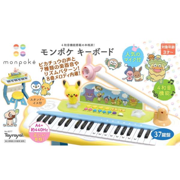 - ピカチュウの声がする!スタンド・イス付きの本格派キーボード! ピカチュウの声でドレミを演奏!4種類のピカチュウの声がするボタンもついています!ピカチュウの光るインジケーター、人気のマイクもピカチュウの形♪ 正しい音程、4和音機能搭載、37鍵盤の本格派キーボードです。 対象年齢:3才? 材質 ABS樹脂、ポリプレピレン、塩化ビニル樹脂 サイズ 組み立てた状態(マイク最長時):W540mm×D270mm×H745mm / キーボード本体:W540mm×D230mm×H170mm(キーボード本体のみ 重量:1,306g / セット品総重量:2460g) 備考 ※単三乾電池3本使用(別売) ※スタンドを取り外してキーボード本体のみでのご使用も可能です。 ?Pok?mon. ?Nintendo/Creatures Inc./GAME FREAK inc.
