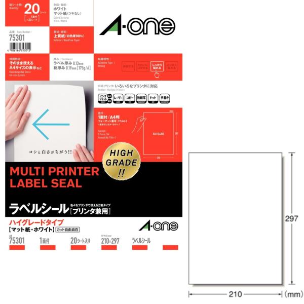 - ★A-one ハイグレードタイプのラベル★厚みしっかり、印字が映える上質紙使用■メーカー:エーワン■品番:75301■シートサイズ:A4■面付:1面■入り数:20シート(ラベル20枚分)■ラベルサイズ:210×297mm■インクジェット、レーザー、コピー機対応■総厚み:0.19mm(約)■材質:上質紙