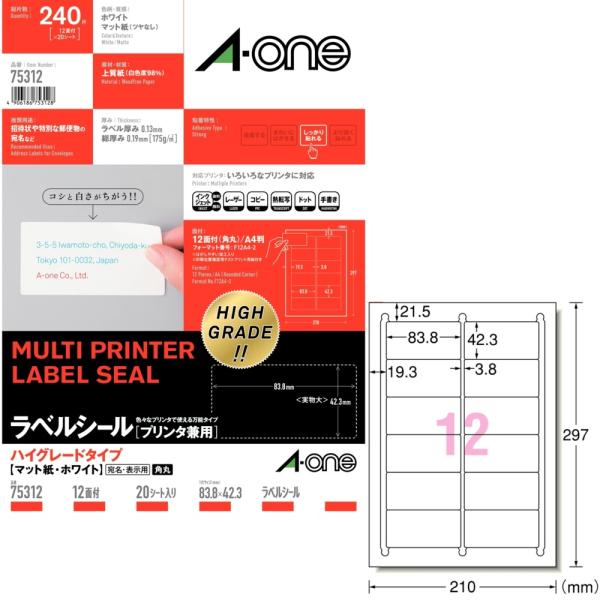 - ★A-one ハイグレードタイプのラベル★厚みしっかり、印字が映える上質紙使用■メーカー:エーワン■品番:75312■シートサイズ:A4■面付:12面■入り数:20シート(ラベル240枚分)■ラベルサイズ:83.8×42.3mm■インクジェット、レーザー、コピー機対応■総厚み:0.19mm(約)■材質:上質紙