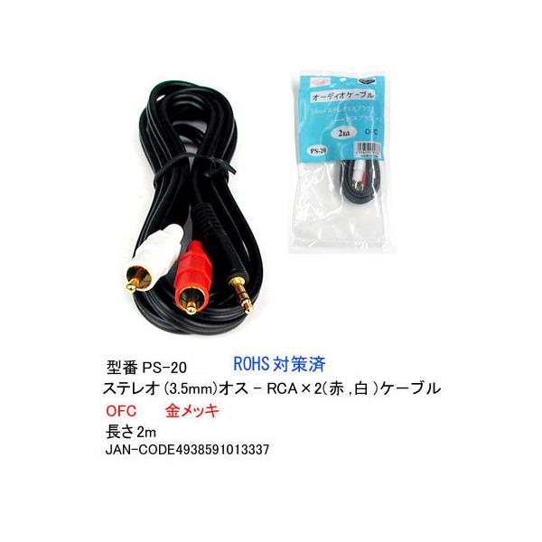 3.5mmステレオプラグ(オス)⇔RCA(赤/白)/オス変換ケーブル/OFC/金メッキ/2m (3C-PS-20)