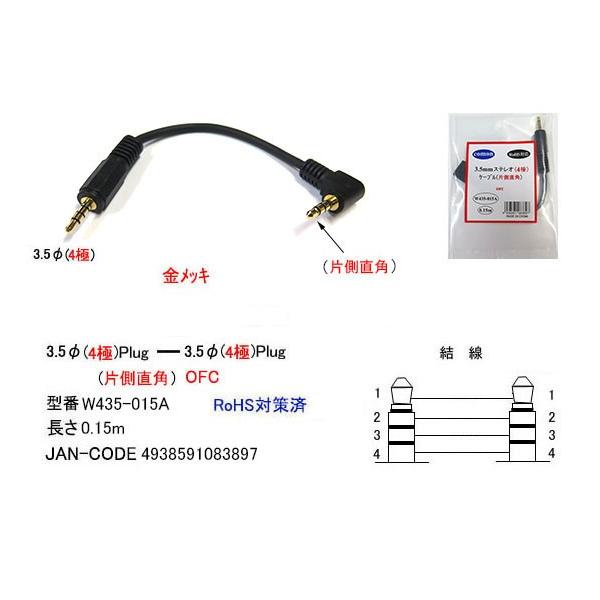 3.5φ(4極)ケーブル(オス⇔オス)/片側直角/OFC/金メッキ/15cm(3C-W435-015A)
