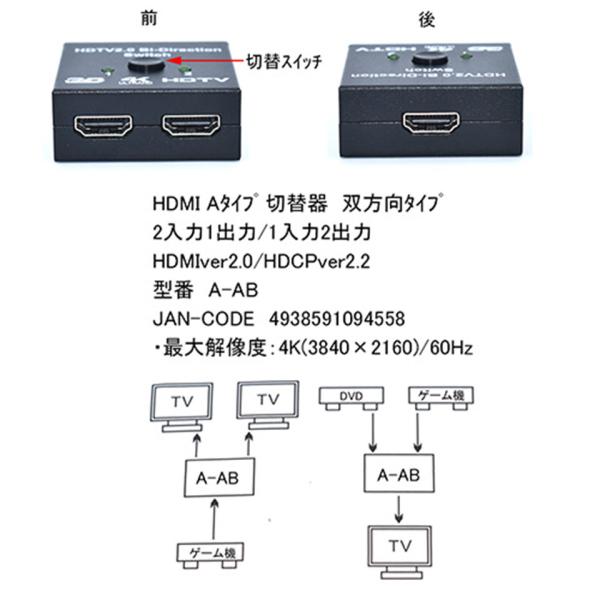 - HDMI切替器(双方向タイプ) ●切替方式A 1台のパソコンやゲーム機を2台のモニターやテレビを接続しどちらか片方のモニターを切替て使用する場合 ●切替方式B ゲーム機やパソコンなど2台の映像を送り出す装置を接続し1台のモニター(テレビ)に接続、表示に必要なパソコンやゲーム機のどちらかを切替て表示する場合 電源不要の小型コンパクト設計 4K2K 最大画質3840x2160 /60Hzの解像度まで対応、HDCPやdeep color機能にも対応 オーディオ機能DTS Dolby Digitalにも対応動画再生に最適 本体のボタン操作で切り替え可能(大切な発表時にリモコン等での切替トラブルを防ぎます。) ※全ての組み合わせで動作を保証するものではございません。. ※HDMIケーブルは付属しておりません。別途お買い求めください。 商品説明 本体A面 :HDMIタイプA端子 2系統 本体B面 :HDMIタイプA端子 1系統 規格 :HDMI Ver2.0 HDCP Ver2.2 Deep Color、4K2K対応 対応信号:480i、480p、720p、1080i、1080p、2160p 電源不要 内容量 1個 端子には数種類の規格がございますのでご購入時にはお使いの製品・サイズ・規格等を確認した上でご購入お願いいたします。 また、機器によりましては相性などにより正常に動作しない場合もございます。 メーカー様の都合にて形状や長さ等が画像と異なる場合がございますがご了承お願いいたします。 不良品以外の返品・交換はお断りさせて頂いております。
