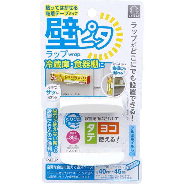 - 〇ラップホルダーです。サッと取り出したいラップをスマートに壁面収納できます。磁石が使えない所にも設置できます。設置場所に合わせて縦・横どちらでも使えます。収納可能なケースサイズは、約4〜4.5cm以内です。くりぴたシートで、くり返し貼りかえOKです。※設置面によっては取り付けられない場合がございます※取り付けご2時間以上経過してからご使用ください※リニューアルによりパッケージや成分が異なる場合がございます●サイズ(約)・6.5×6.5×奥行4cm●耐荷重(約)・350g(横向きの場合:200g)●耐熱60度●材質・本体:ABS樹脂 粘着層:特殊ポリウレタン、アクリルフォーム●用途・ラップの収納 ラップケース アルミホイル キッチン 壁面収納●キーワード・らっぷ あるみほいる ほるだー けーす きっちん 100均 100円均一●品名・壁ピタラップ●品番・KK-273●JAN・4956810802654●メーカー名・(株)小久保工業所●管理単位・10個/240個●入数・1個