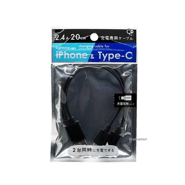 - iPhone&Type-c用 2台同時に充電できる 片面接触タイプ 2.4A 意匠・実用新案取得済商品 長さ:約20cm 対応機種:Type-C端子搭載のスマートフォンやタブレット、ゲーム機等 ライトニングコネクタ対応の機種 材質:コネクタ部:ナイロン・鉄/ケーブル部:ポリ塩化ビニル・銅 中国製