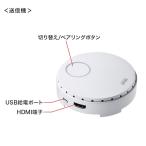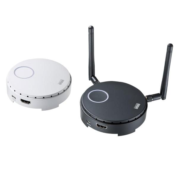 - HDMI信号をワイヤレスで送信し離れた場所に設置された液晶テレビやプロジェクターから出力できる、ワイヤレスHDMI送受信機のセットモデル。送信機は64台まで増設でき、ボタン1つで瞬時に切り替えが可能。※箱にキズ、汚れがありますが商品は新品です。<特長>●HDMI信号をフルHD(1920×1080ドット)解像度で最大15mまで、ワイヤレスで延長することができます。※使用環境により異なります。●HDMIを搭載したパソコン、書画カメラなどの映像出力機器側と送信機を、液晶テレビやプロジェクターと受信機を接続するだけですぐにワイヤレス化できます。●送信機と受信機はペアリング済みなので接続するだけで相互リンクを開始します。ソフトウェアなど面倒な設定は不要です。●5V/900mAのUSB給電で動作するためノートパソコンやタブレットなどを使用した会議システム・プレゼンテーション環境に最適です。※USB3.0ポートからの電力供給を推奨します。USB2.0ポートからの給電では機器により充分な電力が供給されないことがあります。●簡単なペアリング操作で別売りの送信機(VGA-EXWHD6TX)を最大64台まで追加することが可能です。複数のHDMI機器をボタン1つで切り替えて次々にワイヤレス出力させることが可能です。●切り替え時間・切り替え表示は1秒以下で行われ、次の映像出力を待つことなくスムーズに会議やプレゼンテーションを行えます。※映像表示時間は平均1秒以下です。(HDMI機器が常時映像出力状態にある場合に限る)ただし全ての機器での動作を保証するものではありません。●送信機側のボタン操作で延長出力表示を一時的にOFFにする機能を搭載しています。プレゼン時など不必要な表示をしたくない場合などに便利な機能を搭載しています。※表示OFF時は本製品のデフォルト画面がテレビ・プロジェクターに表示されます。●高画質なHDMI画像信号と同時に高音質な音声信号もワイヤレスで延長できます。●HDCP(High-bandwidth Digital Content Protection)対応製品です。※ディスプレイ、出力機器もHDCPに対応している必要があります。●日本国内で使用するための技術基準適合証明(TELEC認証)取得済みです。<ご注意>※本製品は同一空間内(約200平方メートル)での同時使用セット台数について最大4セットまで同時使用できる性能を有していますが、送信機同士・受信機同士が近すぎる場合などでは正常に動作しないことがあります。接続機器・電波環境により動作結果が大きく異なりますので複数セット同時使用については動作保証外とさせて頂きます。 ※隣接する部屋同士で本製品を使用していた場合、電波が干渉する距離範囲内の場合は正常に動作しないことがあります。その際はいずれかの製品のご使用を停止してください。 ※本製品は送信機・受信機が個々にペアリングされるため、ペアリング外の機器と混信することはありません。※すべての機器での動作を保証するものではありません。<仕様>■対応表示解像度:1920×1080、1680×1050、1440×1050、1440×900、1360×768、1280×768、1280×720、1184×666、1024×768、960×600、800×600 ■伝送距離:最大15m(障害物なし)※使用環境により異なります。 ■HDCP:対応※ディスプレイ、出力機器もHDCPに対応している必要があります。■使用周波数帯域:5.1〜5.25GHz ■インターフェース:送信機/HDMIタイプA(19pin)メス×1受信機/HDMIタイプA(19pin)メス×1■増設台数:送信機/最大64台まで(受信機1台に対し送信機を最大64台まで増設可能)受信機/増設不可■同一空間内使用台数:200平方メートル内に最大4セットまで(動作保証外) ■機器間制御:CEC非対応 ■対応音声フォーマット:PCM ■映像遅延:100ms以内 ■材質:ABS樹脂、PVC(ポリ塩化ビニル)■環境条件:動作時/温度0〜40℃ 湿度10〜80%以下(結露なきこと)保管時/温度-10〜60℃ 湿度5〜90%以下(結露なきこと)■サイズ:送信機/直径90×H25mm受信機/直径95×H25mm(アンテナ含まず)■重量:送信機/約90g受信機/約100g■付属品:ACアダプタ(DC5V 1.5A・受信機用)×1、給電用USBケーブル(約150cm×1、約30cm×1)、HDMIケーブル(約60cm×1、約30cm×1)、アンテナ×2、ベルクロストラップ×1、ブラケット×1、ネジ×4、取扱説明書■メーカー保証:1年■対応機器:HDMI出力端子を標準搭載している映像機器・パソコン・書画カメラなど ■対応入力機器:HDMI入力端子を標準搭載しているテレビ・パソコン用ディスプレイ・プロジェクターなど<関連キーワード>4969887593561 ワイヤレス,HDMIエクステンダー,ボタン切替,セットモデル,送信・受信