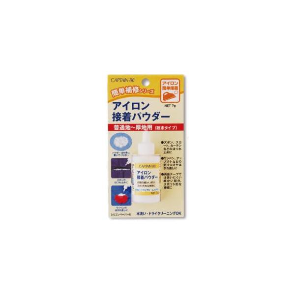 - 補修材料 『CAPTAIN88 アイロン接着パウダー 7g』 キャプテン CP-182 貼り直しや補強など補助的な使い方に。扱いやすい手のひらサイズ。 しみ出しの心配のない粉末タイプのアイロン接着パウダー。両面テープでは使いにくい細かい部分、スポット的な補修に。 ◆7g入り ポリアミド系パウダー ※モニターによって実物のお色と若干異なる場合がございます。 【手芸用品・毛糸・生地の専門店 ユザワヤ】