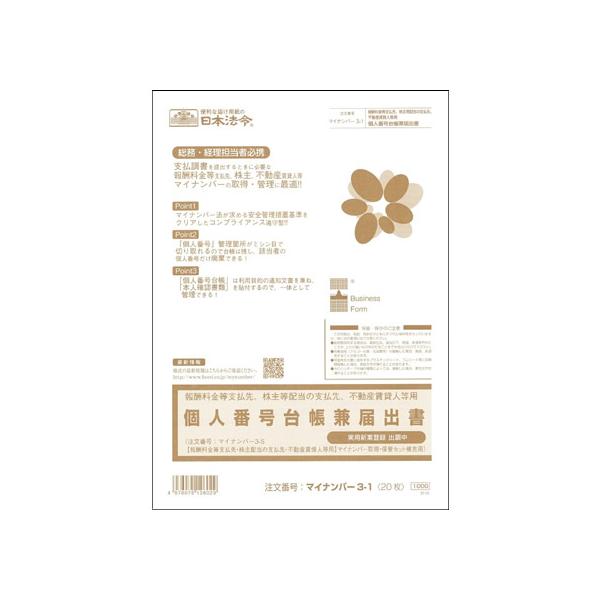 日本法令 個人番号台帳兼届出書 20枚 マイナンバー3-1 総務 庶務 法令様式 ビジネスフォーム ノート