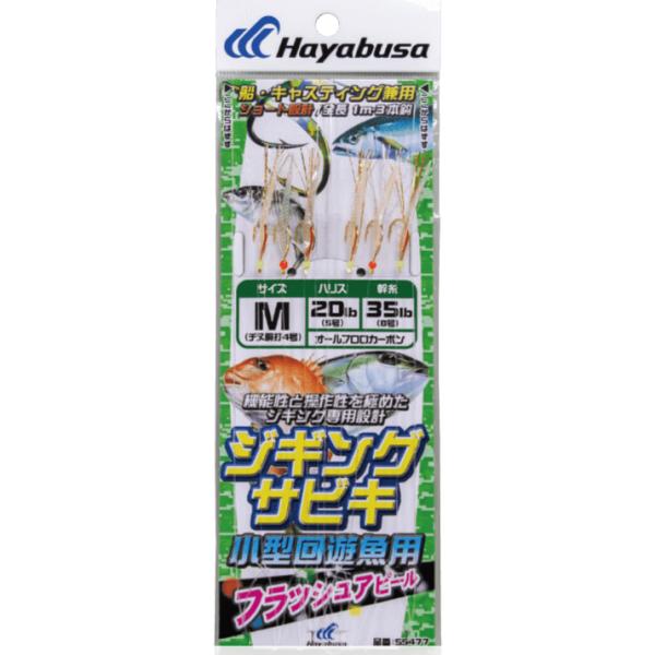 ジギングシーンで安定した釣果を約束する「ジギングサビキ」のフラッシュアピールタイプ。「サビキのハヤブサ」独自の経験から導き出された、フラッシング効果の高いホログラムシールとブライトン、鈎自身もフラッシングする胴打鈎を組み合わせました。