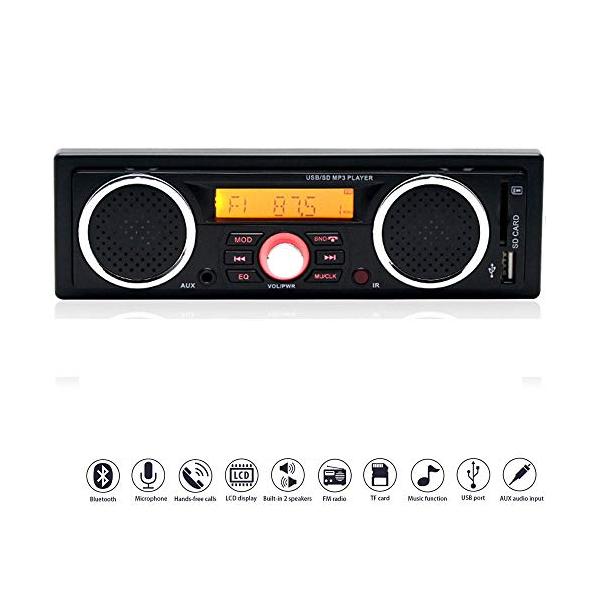 - Bluetooth+マイクを内蔵し、ハンズフリー通話をサポートします。これにより、運転がより安全で便利になります。また、WMA、WAV、MP3、その他の形式をサポートしています。 ビルトイン2スピーカーは、元の車のスピーカーの音質と音色と比較して、より柔らかく、純粋で、より衝撃的な低音があり、車への2番目のスピーカーの設置を避けます。 プレーヤー-TFカードスロットおよびUSBポートに内蔵。フォルダ再生機能、ブレークポイントメモリをサポート。Bluetooth経由でスマートフォンからデジタルメディアを再生 ナビゲーション、MP3、MP5、携帯電話などのAUXオーディオ入力をサポートします。シャットダウン後の時間を表示できるため、運転中に時間を確認するのに便利です。 ラジオ受信-高品質のデジタルステレオを備えたFMラジオ。全自動、半自動、正確な調整方法でチャンネルを検索できます。1~6個の無線チャネルを保存できる3バンド無線ストア(FM1-FM2-FM3)をサポートします。注:当ラジオの周波数は87.5-108MHzで、日本国内の周波数は76-108MHzので、76-87.5FMが聞けません。
