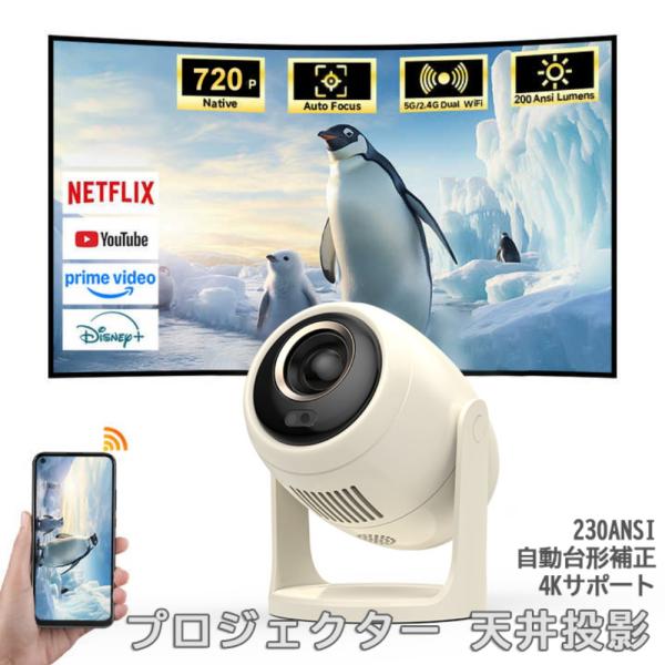 プロジェクター 小型 家庭用 天井投影 スマホと繋げる 1080P&4K対応 スマホ 高画質静音 自動フォーカス 自動台形補正 高輝度 Netflix/YouTubeb android搭載