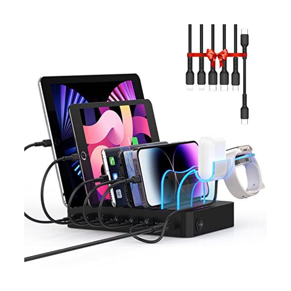 首佩 急速充電60W 6ポートUSB充電ステーション、PSE認証済 充電スタンド 6本の充電ケーブルが含まれ、 iPhone iPad iWat