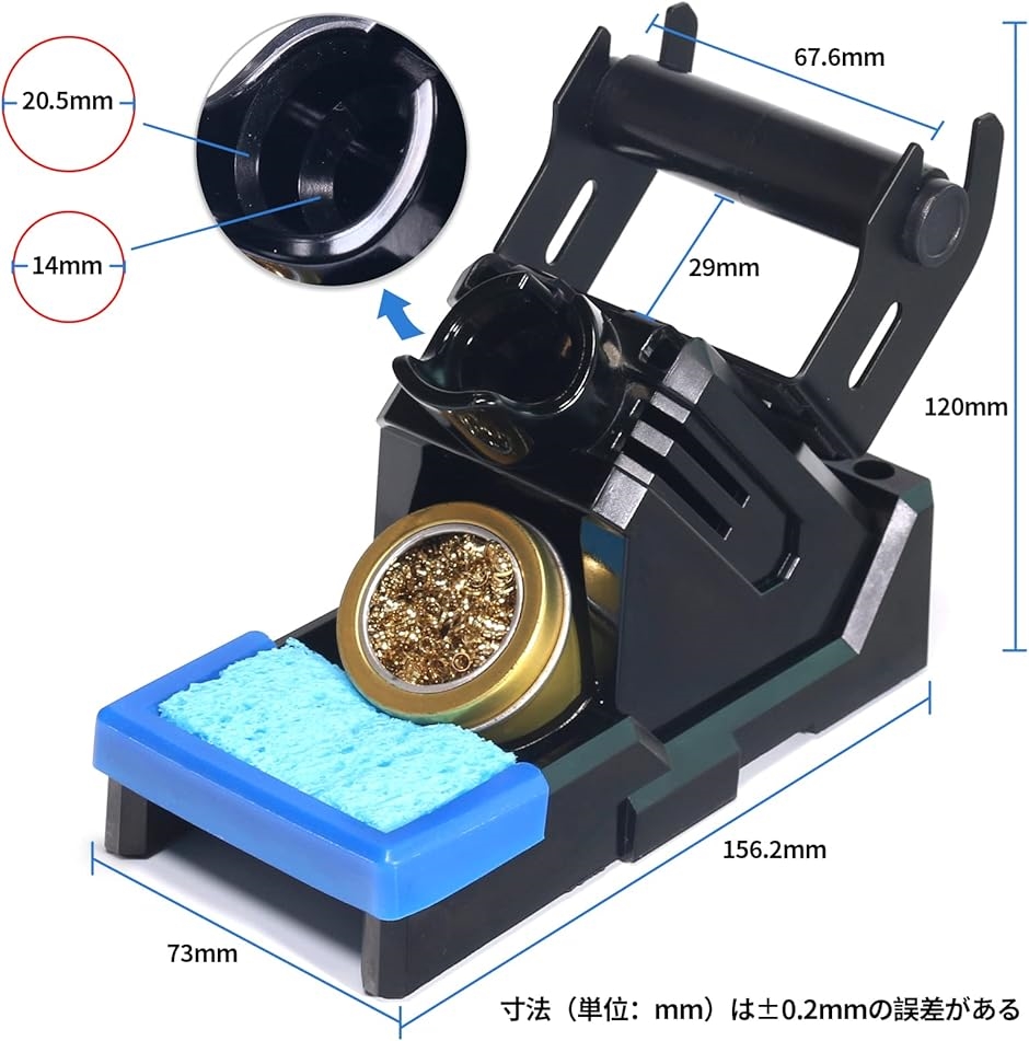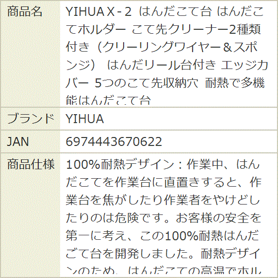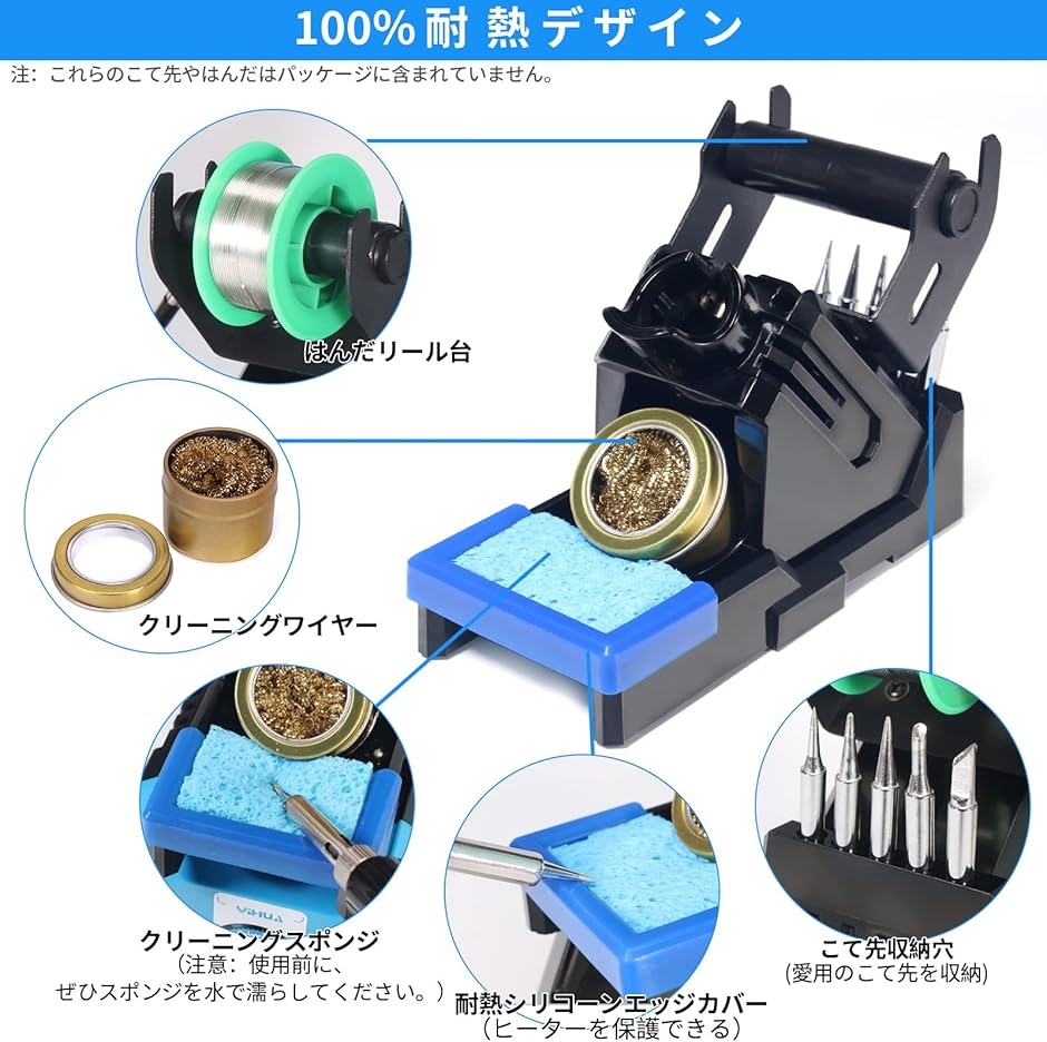 - 100%耐熱デザイン:作業中、はんだこてを作業台に直置きすると、作業台を焦がしたり作業者をやけどしたりのは危険です。お客様の安全を第一に考え、この100%耐熱はんだごて台を開発しました。耐熱デザインのため、はんだこての高温でホルダーが損傷する心配がありません。(注意: 測定のサイズを読み、お客様のはんだこてによって適合することを確かめてください)安定性が高い:はんだこて台を作業台にしっかり置くために、ベースの重心を下げて重量を増やして、安定感も安全性も倍になりました。はんだこて台の底には滑り止めのゴムストライプがついて、作業中や収納時に滑り落ちるのを防ぎます。多機能&省スペース:はんだリール台、はんだこてホルダー、クリーニングキット(ワイヤー&スポンジ)、こて先収納穴を一体化にして、作業台はきれいになれますので、作業性も格段に向上になりました。巧みのエッジカバー:こて先についた余分のはんだを振り落とす時、こて先を硬いものにぶつけてしまて、ヒーターは壊しやすいです。クリーニングスポンジの周囲にシリコーンエッジカバーを付いて、クリーニングする時の衝撃をやわらげて、ヒーターもしっかり保護されます。※ 他ネットショップでも併売しているため、ご注文後に在庫切れとなる場合があります。予めご了承ください。※ 品薄または希少等の理由により、参考価格よりも高い価格で販売されている場合があります。ご注文の際には必ず販売価格をご確認ください。※ 沖縄県、離島または一部地域の場合、別途送料の負担をお願いする場合があります。予めご了承ください。※ お使いのモニタにより写真の色が実際の商品の色と異なる場合や、イメージに差異が生じることがあります。予めご了承ください。※ 商品の詳細(カラー・数量・サイズ 等)については、ページ内の商品説明をご確認のうえ、ご注文ください。※ モバイル版・スマホ版ページでは、お使いの端末によっては一部の情報が表示されないことがあります。すべての記載情報をご確認するには、PC版ページをご覧ください。YIHUAX‐2は多機能を一体化したスマートなはんだこて台です。よりよい安全性を提供したり、はんだリール台やこて先収納穴を付いたり、2種類のクリーナーを自由に選んだりします。