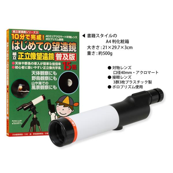 - 星の手帖社 口径40mmのアクロマート対物レンズ。ポロプリズムを使った倍率15倍の組立式望遠鏡。 初心者でも扱いやすい低倍率の正立像ですので、天体や野鳥などの導入が簡単に行えます。天体観察、野鳥観察のほか、山や海での風景観察も手軽に行えます。 組み立てには工具は不要。誰にでも簡単に組立てることができます。 「望遠鏡の使い方・楽しみ方」(モノクロ版・16ページ)が付属 観察が便利になる必携アイテム 滑らかに動いてぴたっと止まる!「組立天体望遠鏡用 木製架台」 ■仕様 ・対物レンズ口径:40mm ・焦点距離:273mm ・接眼レンズ焦点距離:18.2mm ・倍率:15倍誰にでも簡単に組み立てられる昼は野鳥、夜は天体を観察工作の面白さと観察の楽しさの両方を体験