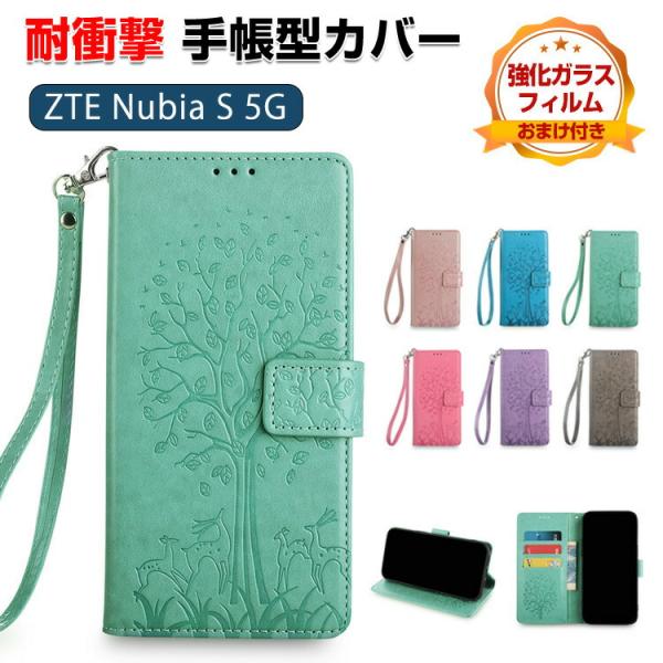 - ZTE ヌビア Nubia S 5G ケース 耐衝撃 カバー 手帳型 財布型 TPU+PUレザー おしゃれ 汚れ防止 スタンド機能 便利 実用 カード収納 ストラップ付き カッコいい 人気 便利性の高い スマホ 手帳型カバー CASE 強化ガラスフィルム おまけ付き