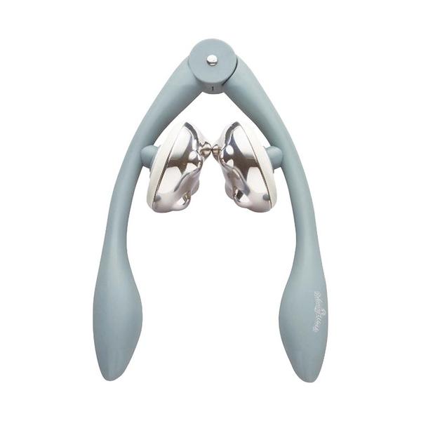 【首】/肩/脚リラックス用品。パソコン仕事、スマホを見て疲れた首や肩のコリほぐしに効果的。首や肩を手指でしっかり押す心地のコンパクトバー。1.首を心地よく挟み揉み2.ボールが動き心地くフィット3.4つの突起付きひんやり金属ボール