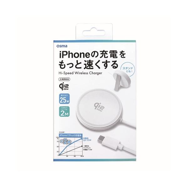 - OSMA WLC-Q22C200WH 25W対応Qi2充電器 スタンド機能付 USB PD対応 2m ホワイト 500