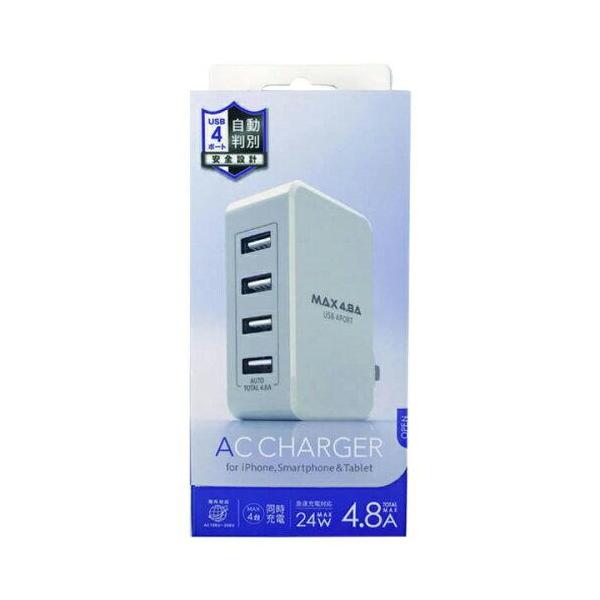 - 【商品解説】USB−Aポート(4ポート)は自動判別機能付きで接続した端末機器がApple端末かAndroid端末かを判別し、充電器の定格電流の範囲内で最速な充電を行います。また、過電流から本製品や接続した端末を保護する機能を搭載しています。※ご使用のケーブルに異常がないことをご確認の上、ご使用下さい。※4台同時充電する場合は各ポートの出力は1.2Aとなります。スイングプラグ仕様でプラグが収納でき持ち運びに便利です。100V240Vの海外対応モデル【スペック】●型式:IHACU448ADW(ホワイ(IHACU448ADW)●JANコード:4582439000098本体サイズ(幅×高さ×奥行)mm:約W29×H76×D52mm本体重量:約87gポート数:4ポート定格出力電力:24W定格出力電圧:5V定格出力電流:4.8Aタブレット対応:対応Smart IC 対応:Smart IC対応仕様1:入力:AC100V-240V 50/60Hz仕様2:出力:各ポートDC5V/最大2.4A 4ポート合計/最大4.8A仕様3:使用環境温度:5〜35℃この商品は宅配便でお届けする商品です出荷可能日から最短日時でお届けします。※出荷完了次第メールをお送りします。配送サービス提供エリアを調べることができます「エリア検索」をクリックして、表示された画面にお届け先の郵便番号7桁を入力してください。ご購入可能エリア検索お買い上げ合計3,980円以上で送料無料となります。※3,980円未満の場合は、一律550円(税込)となります。●出荷可能日から最短日時でお届けします。(日時指定は出来ません。) ※お届け時に不在だった場合は、「ご不在連絡票」が投函されます。 「ご不在連絡票」に記載された宅配業者の連絡先へ、再配達のご依頼をお願いいたします。●お届けは玄関先までとなります。●宅配便でお届けする商品をご購入の場合、不用品リサイクル回収はお受けしておりません。●全て揃い次第の出荷となりますので、2種類以上、または2個以上でのご注文の場合、出荷が遅れる場合があります。詳細はこちら■商品のお届けについて商品の到着日については、出荷完了メール内のリンク(宅配業者お荷物お問い合わせサービス)にてご確認ください。詳しいお届け目安を確認する1度の注文で複数の配送先にお届けすることは出来ません。※注文時に「複数の送付先に送る」で2箇所以上への配送先を設定した場合、すべてキャンセルとさせていただきます。