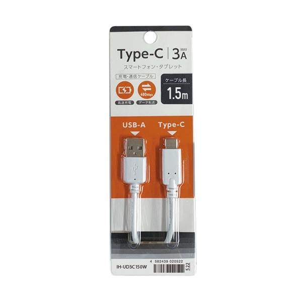 - 【商品解説】●スマートフォン・タブレット用のUSBA to TypeCケーブルです。●充電はもちろん、データ転送にもご使用いただけます。[最大480Mbps]●3A出力に対応しているので、高速充電が可能です。【スペック】●型式:IHUD3C150W(IHUD3C150W)●JANコード:4582439020522サイズ:15mm×1500mm×7mmケーブル長:1.5m重量:68g主な対応機種:Type-C端子搭載のスマートフォン・タブレット充電規格:Quick Charge対応この商品は宅配便でお届けする商品です出荷可能日から最短日時でお届けします。※出荷完了次第メールをお送りします。配送サービス提供エリアを調べることができます「エリア検索」をクリックして、表示された画面にお届け先の郵便番号7桁を入力してください。ご購入可能エリア検索お買い上げ合計3,980円以上で送料無料となります。※3,980円未満の場合は、一律550円(税込)となります。●出荷可能日から最短日時でお届けします。(日時指定は出来ません。) ※お届け時に不在だった場合は、「ご不在連絡票」が投函されます。 「ご不在連絡票」に記載された宅配業者の連絡先へ、再配達のご依頼をお願いいたします。●お届けは玄関先までとなります。●宅配便でお届けする商品をご購入の場合、不用品リサイクル回収はお受けしておりません。●全て揃い次第の出荷となりますので、2種類以上、または2個以上でのご注文の場合、出荷が遅れる場合があります。詳細はこちら■商品のお届けについて商品の到着日については、出荷完了メール内のリンク(宅配業者お荷物お問い合わせサービス)にてご確認ください。詳しいお届け目安を確認する1度の注文で複数の配送先にお届けすることは出来ません。※注文時に「複数の送付先に送る」で2箇所以上への配送先を設定した場合、すべてキャンセルとさせていただきます。