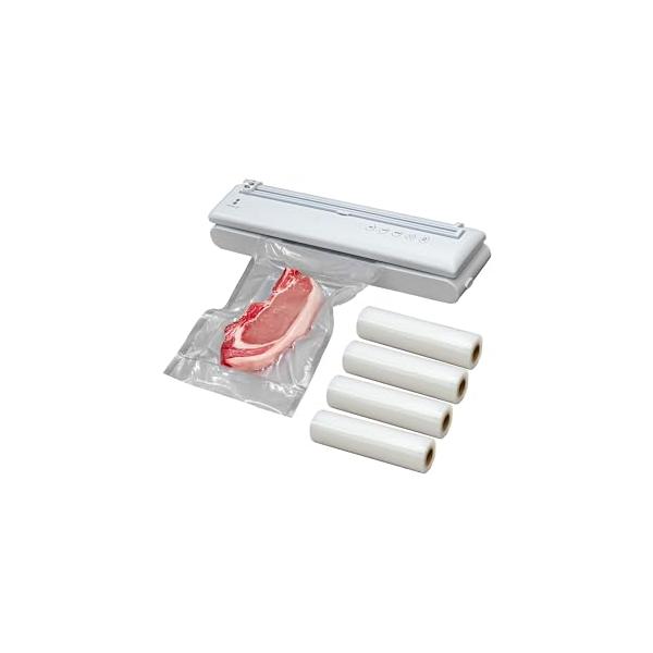 ・?【新鮮なまま保存し、食材を大切に】真空保存によって食材の鮮度を長時間維持し、冷凍焼け等を防ぎながら、美味しさを保ちます。?【パワフルな脱気力で素早く真空に】-60kPaの脱気力で、素早く真空状態にできます。お手軽に真空パックにできます。?【便利な4つのモードを装備】食材や使用目的に応じて4つのモードを搭載しており、用途に合わせて使い分けることができます。?【ロール式の専用真空袋がセット】お好みのサイズにカットして使用できる、5mのロール式専用真空袋が1ロール付属しています。スライドカッターを装備しているのでハサミを使う手間が不要です。?【様々な調理にも便利に使える】・調理の下準備…食材の下味を付ける時に・真空調理…均一に過熱が可能に・低温調理…低温調理機との併用で味を染み込みやすくする・レンジ調理…袋のままレンジ調理が可能?【冷蔵庫内もスッキリと整頓できる】余った食材を真空パックでスッキリ収納。密閉状態の為、食材のニオイ移りも防ぎます。?【30cmの幅広い圧着口】圧着口が30cmと幅広い為、同時に複数の真空処理や密閉に対 - 楽天での商品説明(アルメリアセカンドストア)