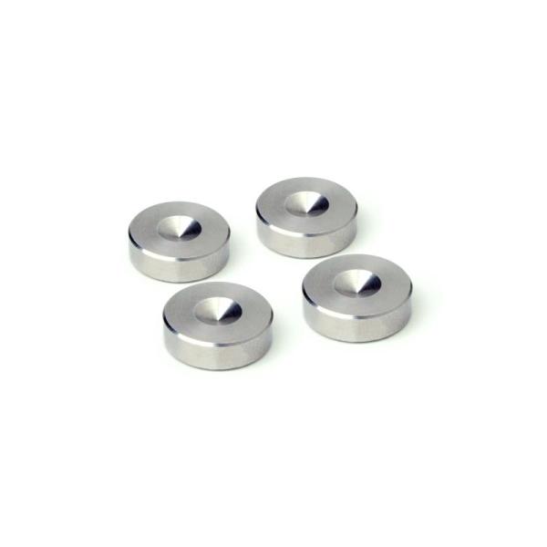 スパイク使用においては通常、床面に傷を付けないようにスパイク受けが用いられますが、スパイク受けの持つ物性もまた音質に大きく影響することが知られています。また、スパイク受けには2つの必須条件が求められます。それは、高い寸法精度と、一点荷重にも耐えられる高剛性な素材で形成されていることです。スパイク受けの寸法精度が低いと、スパイクとの間に隙間が生じて機器がぐらつき、点接触が万全に機能できません。