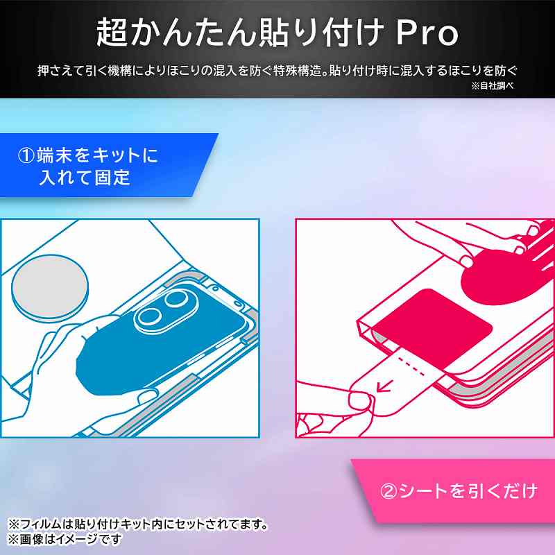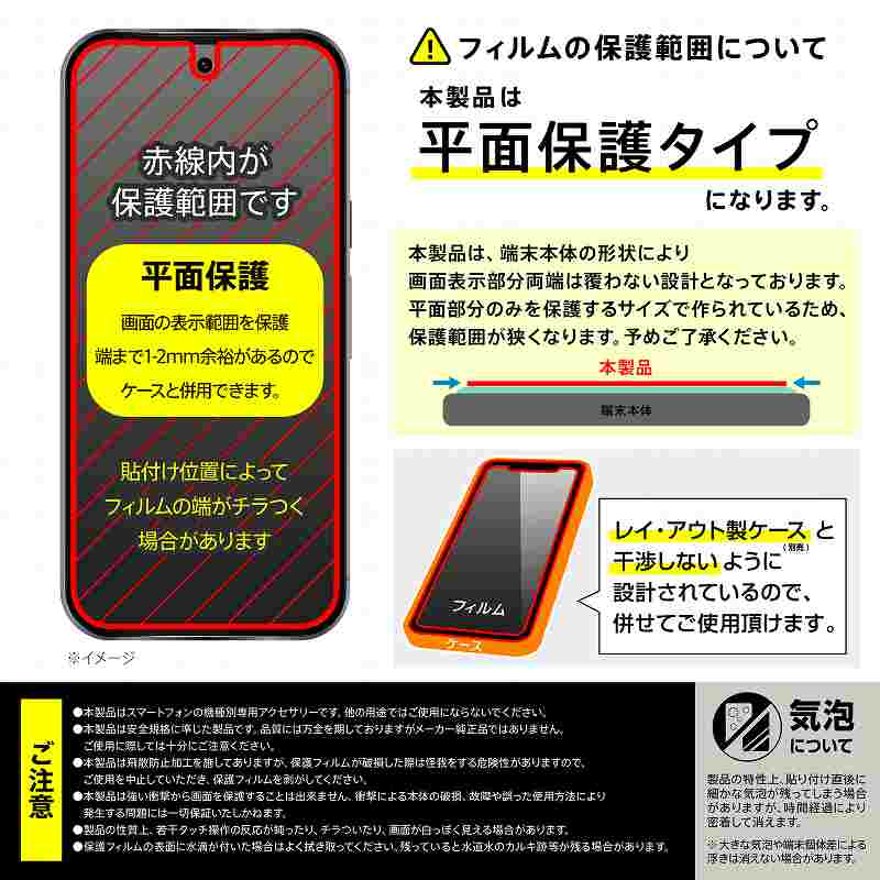 誰でも簡単に貼り付けができる貼り付けキット付きで失敗しない。PETフィルムの約5倍の硬度で傷付きにくい。美しい光沢仕様で、高画質な写真や動画が綺麗に見える。防汚コーティングで指紋防止効果。レイ・アウト製ケース(別売)と一緒に使用しても干渉しない設計。