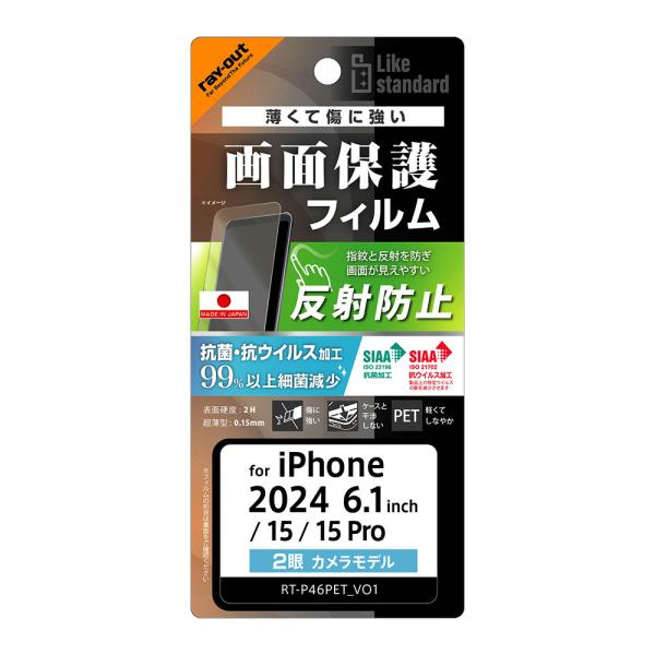 レイアウト iPhone 16/ 15/ 15 Pro用 Like standard 液晶保護PETフィルム 反射防止 抗菌・抗ウイルス 平面保護 指紋防止 RT-P46F/ B1 返品種別A