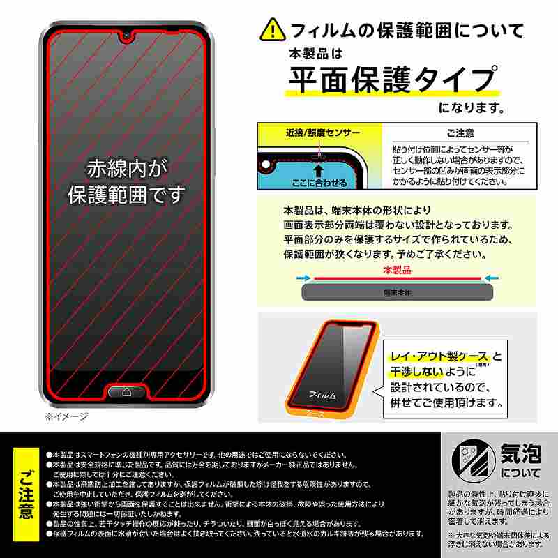 PETフィルムの約5倍の硬度で傷付きにくい。太陽光や照明の反射を防ぐので画面が見やすい。防汚コーティングで指紋防止効果。レイ・アウト製ケース(別売)と一緒に使用しても干渉しない設計。