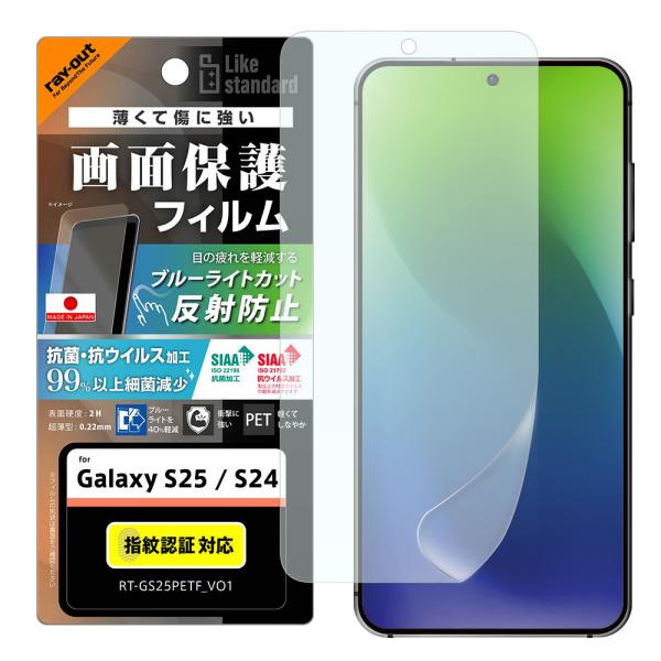 レイアウト Galaxy S25 / S24用 PETフィルム 反射防止 衝撃吸収 抗菌・抗ウイルス 平面保護 指紋防止 指紋認証対応 Like standard RT-GS25F/ DK 返品種別A