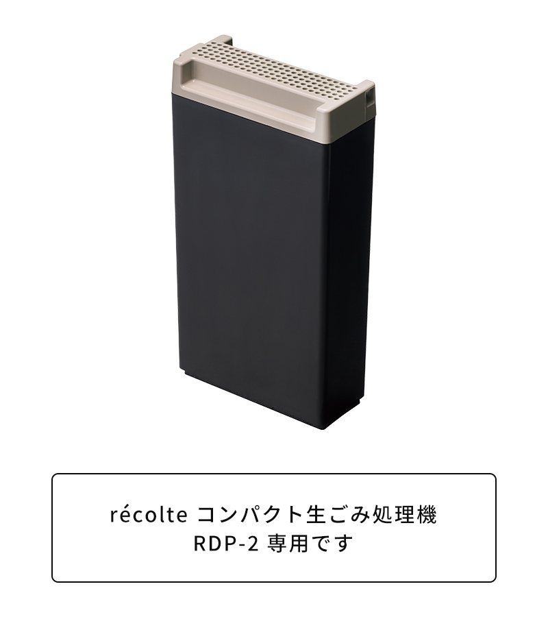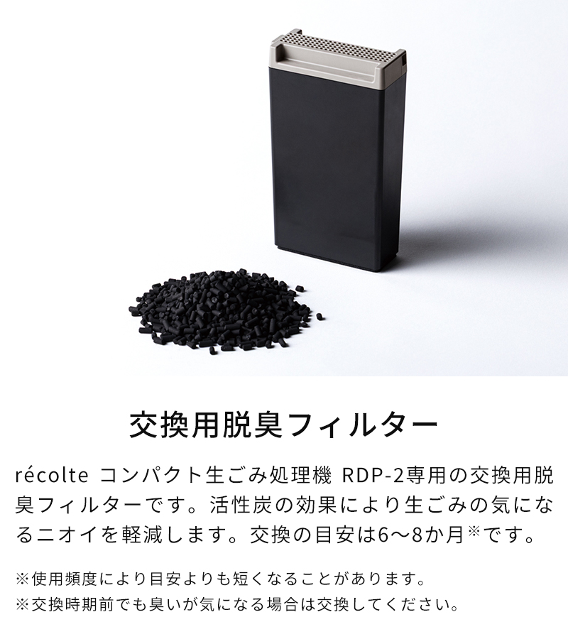 生ごみを乾燥・粉砕処理できる「recolte コンパクト生ごみ処理機 RDP-2」専用の交換用脱臭フィルターです。活性炭の効果により生ごみの気になるニオイを軽減します。交換の目安は6〜8か月です。 - 楽天での商品説明(plywood zakka(インテリア雑貨))