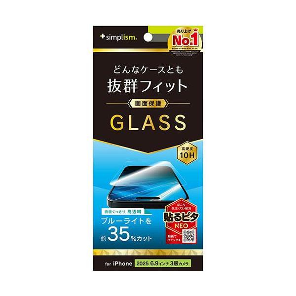 トリニティ iPhone17 Pro Max用 ケースとの相性抜群 黄色くないブルーライト低減 画面保護強化ガラス 光沢 TR-IP25L3-GLS-B3CC