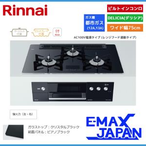 - リンナイ ビルトインコンロ DELICIA デリシア 3口 AC100V電源タイプ 都市ガス 13A 75cm クリスタルブラック RHS71W31E17VCABW-13A