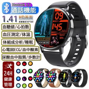- 割引セール スマートウォッチ 軍用規格 丸型 日本製センサー 血圧測定 ECG心電図測定 心拍数 血中酸素測定 通話機能 着信通知 歩数計 音楽・カメラ制御 SOS機能
