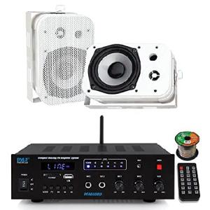 Pyle PFA600BU Compact Bluetooth USB AUX FM Radio Public Address Amplifier Receiver System Combo Bundle with 2X 5.25 400W Max Power Indoor/Outdoor Whit