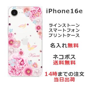 - iPhone16e アイフォン16e らふら 名入れ スマホケース ラインストーン スマホカバー 押し花風 フラワーバードピンク