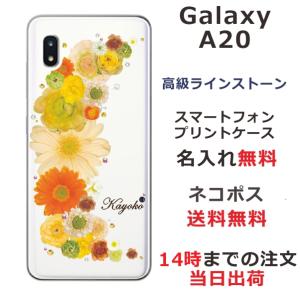 Galaxy A20 ケース SC-02M SCV46 ギャラクシーA20 カバー ラインストーン かわいい フラワー 花柄 らふら 名入れ 押し花風 オレンジ