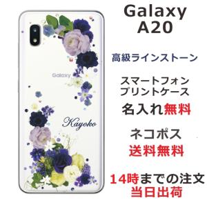 Galaxy A20 ケース SC-02M SCV46 ギャラクシーA20 カバー ラインストーン かわいい フラワー 花柄 らふら 名入れ 押し花風 ブルーアレンジ