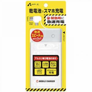 - エアージェイ(Air j) BJ-ECUSB1A WH ホワイト USB TYPE-Cケーブル付 乾電池式緊急充電器 スマホ充電 停電 防災