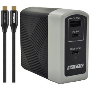 - ADTEC アドテック 140W出力GaN搭載 USB-C PD3.1充電器+マルチプラグProケーブルセット APD-A140AC2-wMPro-BK ブラック