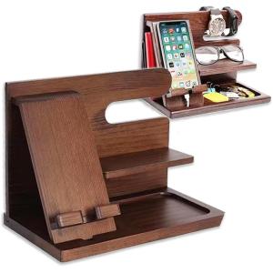 - ガジェット 小物置き デスク オーガナイザー 便利グッズ 木製 スマホ スタンド 卓上 プレゼント (ダークブラウン)