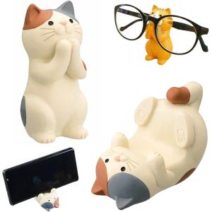 - 猫 スマホスタンド 卓上 スマホ立て 可愛い メガネスタンド メガネ置き インテリア 雑貨 置物 玄関 癒しグッズ (三毛猫セット)