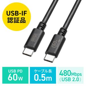 - Type-Cケーブル USB2.0 480Mbps 最大PD60W USB-IF認証品 約0.5m ブラック KU-CCP6005BK