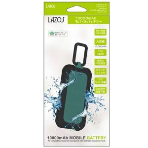 - 防災グッズ Lazos 10000mAh モバイルバッテリー グリーン [L-WPMB10-GR] PD対応 防水防塵 LEDライト カラビナフック付
